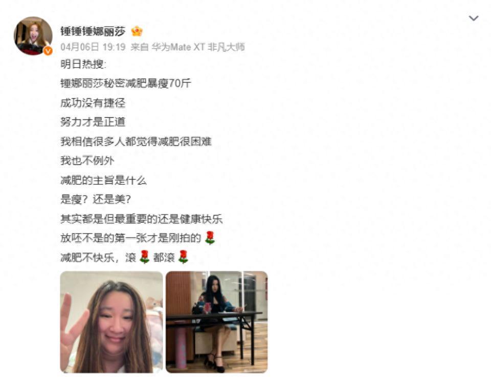 4月6日,中国内地女歌手、演员、短视频创作者锤娜丽莎晒出了一张自己以前瘦的照片,发文谈减肥心态,全文如下: